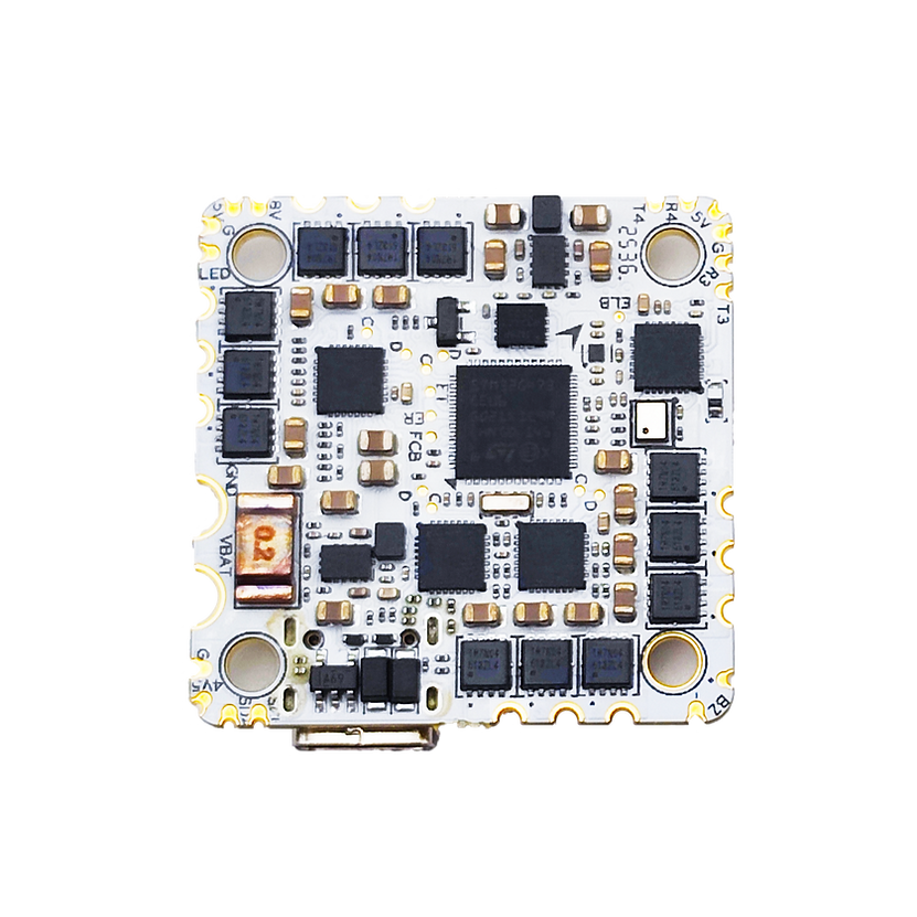 All motor and I/O pads are castellated and edge-mounted, making soldering easier and improving serviceability in tight frames - you can even mount the AIO upside down and still access all of the IO pads. The layout is optimized for clean wiring and straightforward integration of additional peripherals such as GPS, LEDs, or buzzers.
