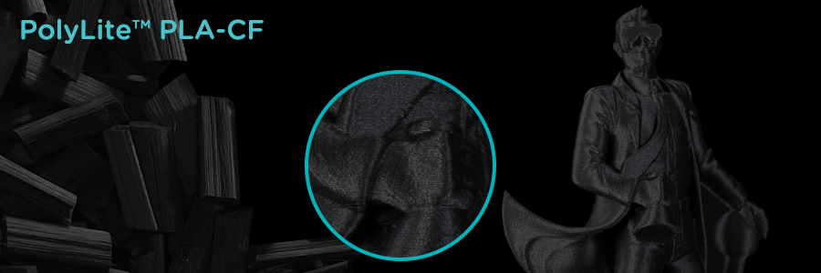 PolyLite™ PLA-CF is a carbon fiber reinforced PLA filament containing 8% chopped carbon fiber by weight; built from the ground up to print stiff models with a high quality matte surface finish. PolyLite PLA-CF combines stiffness and excellent dimensional stability with a smooth looking matte surface finish that hides the layers.