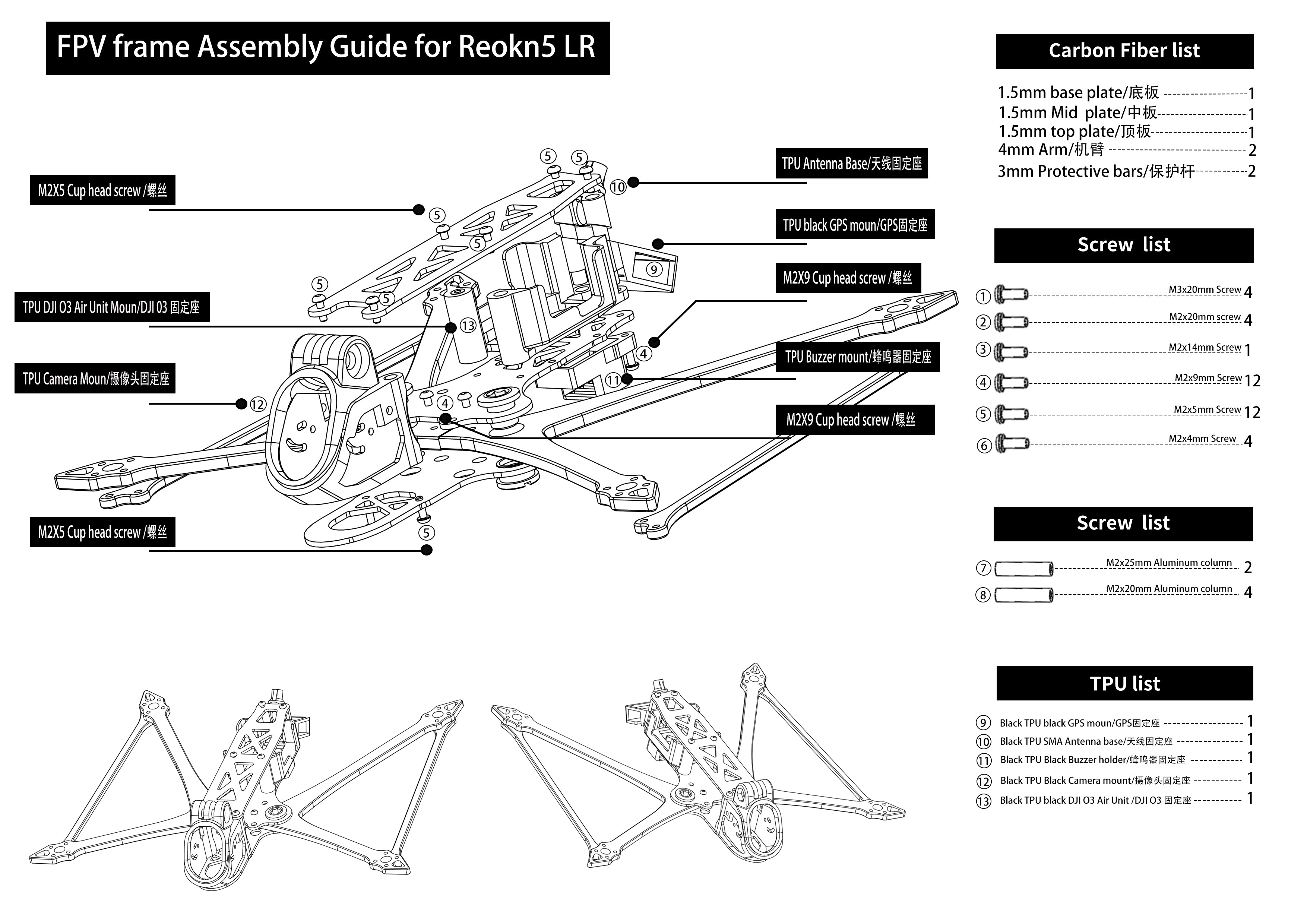 The Rekon 5 features an innovative frame design featuring one-piece front and rear arms locked by 7050 chainring screw. The screws are used to create a strong and rigid part in the center part of the frame, which locks the arms and decouples the force from the rest of the frame,This enables the use of very light M2 screws and thin carbon plates in the rest of the frame, reducing overall weight for max efficiency, and most importantly the chainring screws can take more torque and are not as often used by M2 or M3 screws Occurs easily cracked or peeled off,The design of the front TPU camera seat and the Naked gopro bracket has also received a lot of attention. Since the arms are extended backwards and the drone head is partially exposed, the dead cat frame is prone to collisions at the nose of the drone, but the Rekon 5 It will be flexible to fly.